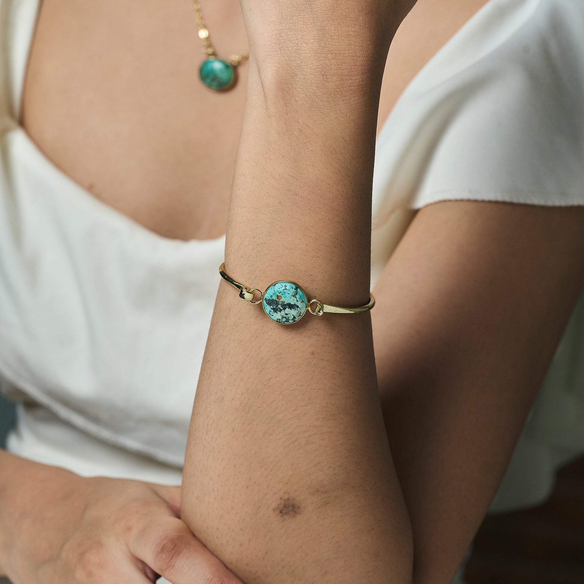 This gold-plated brass bangle features a natural, hand-cut Turquoise stone set at the center for a bold yet timeless look. With its rich blue-green tones and natural matrix, each stone is beautifully one of a kind. Turquoise is often associated with protection, strength, and grounding energy, making this bracelet both meaningful and effortlessly wearable. Finished with a quick-release clasp for easy on and off, it’s perfect worn alone or layered with your favorite bangles.